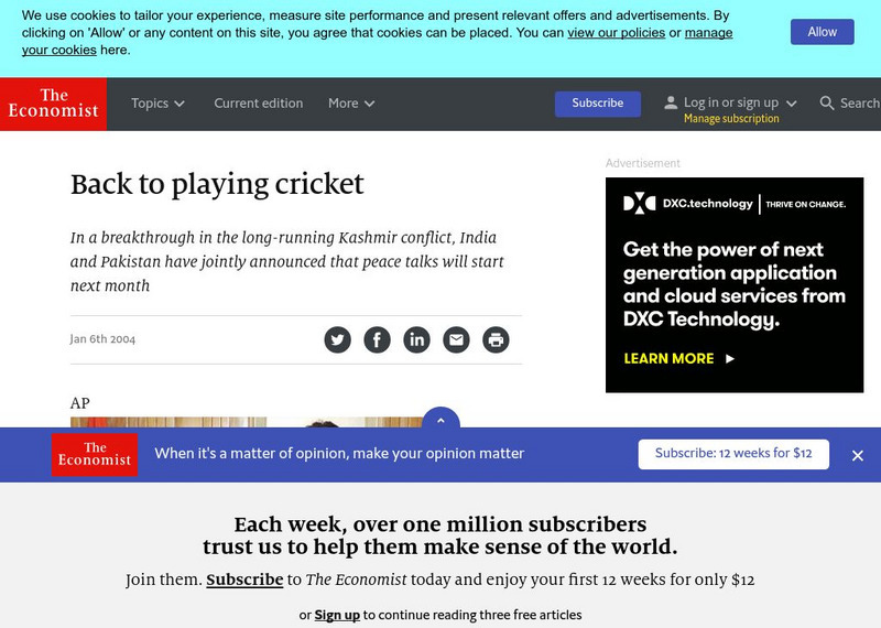 This article dated January 2004 finds India and Pakistan willing to start peaceful negotiations during the cease-fire along the "Line of control." Registration is required.