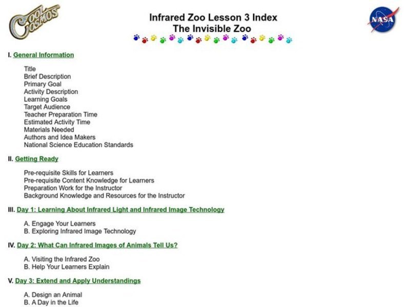 Students explore how infrared images give biologists or zoologists detailed information on how warm-blooded and cold-blooded animals thermoregulate. They are introduced to infrared imaging technology and the information that such images contain. Students discuss their favorite zoo animals and brainstorm about how animals survive in their natural habitats.