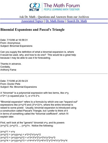 This site answers a student's question inquiring about the definition of a binomial expansion, where it would be used, and why.
