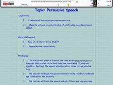 Students examine what makes a speech persuasive. In this speech lesson plan, students recognizes what is needed to make a good persuasive speech and create their own persuasive speech about something related to the human body.