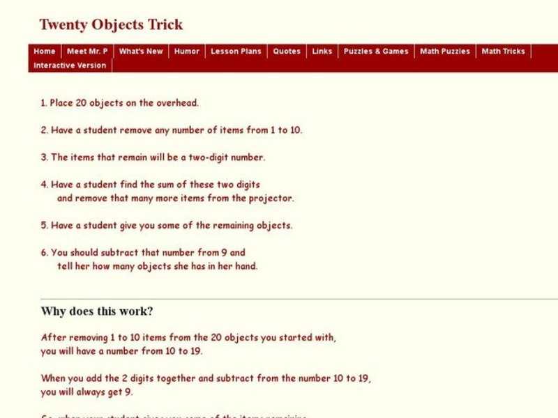 For this problem of the day worksheet, students remove items from a starting amount of twenty objects. The instructor will be able to tell the student how many objects left. The student is them to explain how this works.