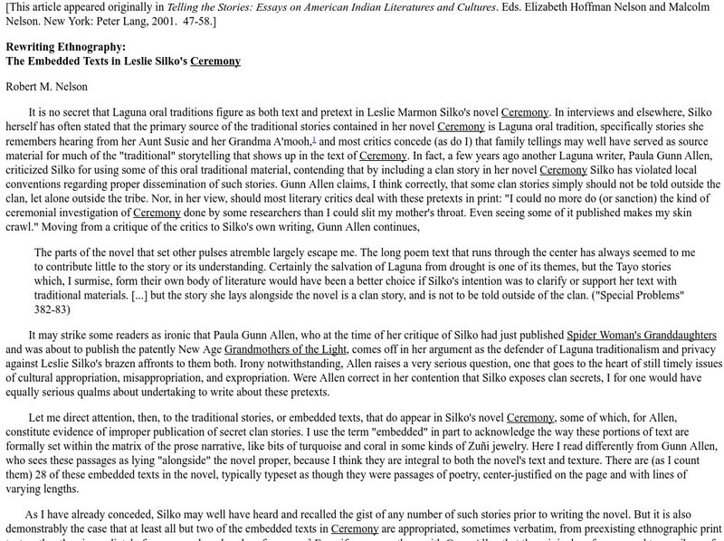 A literary review and criticism concerning the book "Ceremony" by Leslie Marmon Silko. Analyzes the Laguna oral tradition and its presence in Silko's novel.