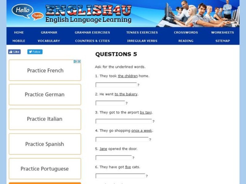 In this using question words in sentences 5 worksheet, student interactively enter the question to complement the given statement, for 15 statements, with immediate online feedback.