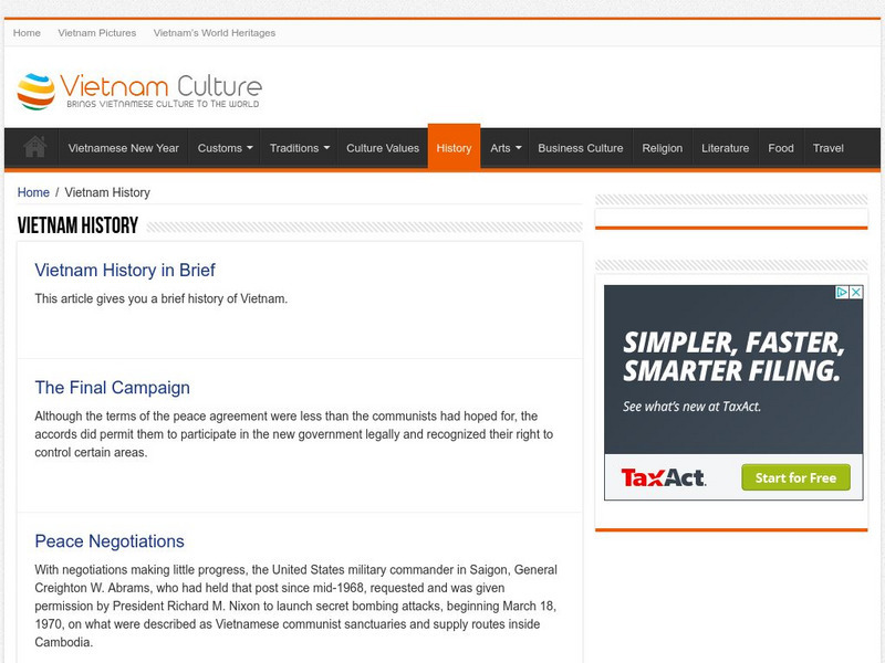 Click on "Vietnam's History in Brief" to get a timeline of important events in the country's history. For more depth, click on the individual topics to learn about everything from Vietnam's early history through to the Vietnam War.