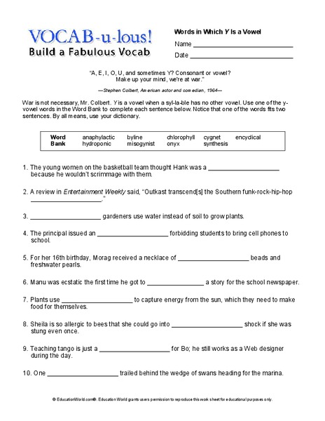In this vocabulary instructional activity, students decipher the best word choice to complete the sentence. All words use Y as a vowel to build a fabulous vocabulary.