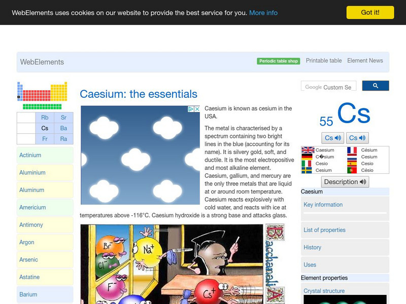 A very helpful site with a great deal of information on caesium and its properties. Very helpful. Includes an audio track of a description of this element, as well as illustrative pictures.