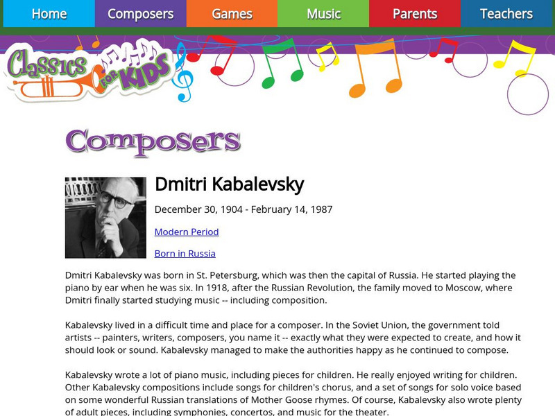 A short biography of Dmitri Kabalevsky (1904-1987 CE). Click to the past radio shows to hear his music and learn more about this famous composer.