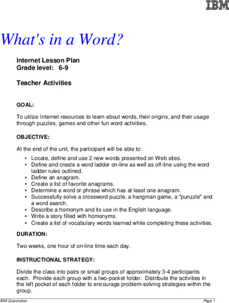 Students complete a unit on words, their origins, and their usage. They explore various websites, create a word ladder online, develop a list of anagrams, write a story using homonyms, and create a list of vocabulary words.