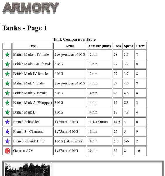 This site provides a "Tank Comparison Table" outlining the specifications for several different types of tanks used in World War I, as well as photographs of tanks and descriptions.