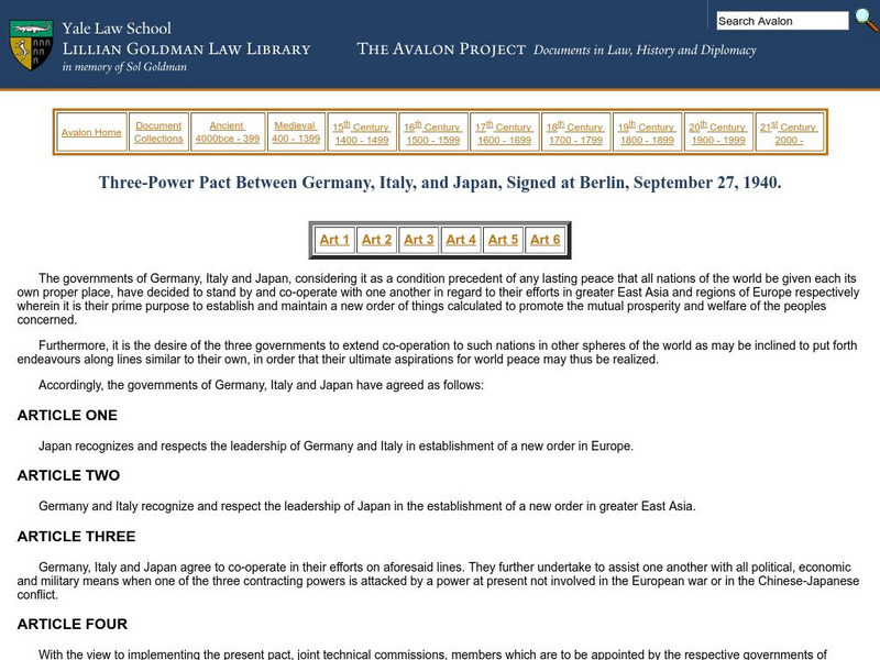 Original 6 -art article. Italy, Germany and Japan enter agreement that none will agree to an armistice or peace without the reciprocal agreement of the three.